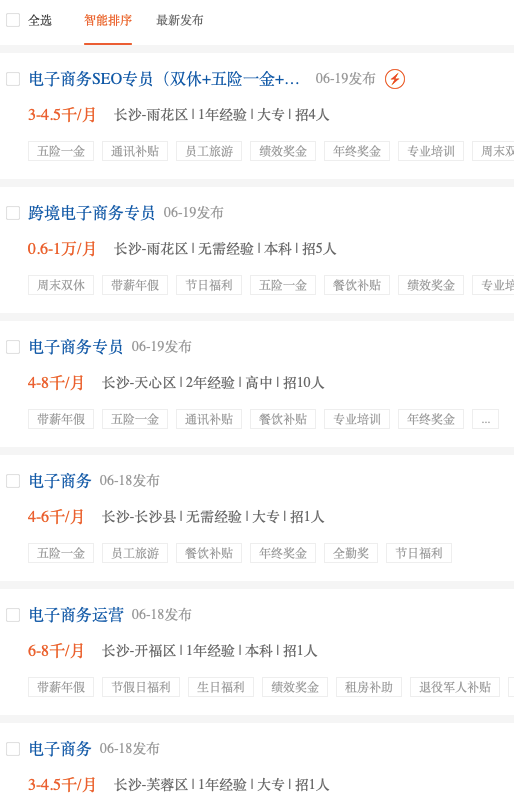在智联招聘搜时下最火的“电子商务”有以下结果: