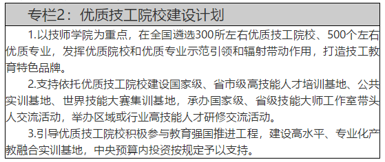 以技师学院为重点,在全国遴选300所左右优质技工院校、500个左右优质专业。